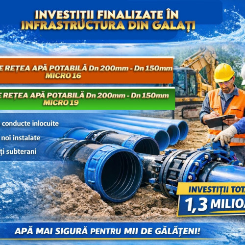 Pe 30 ianuarie 2026, Apă Canal Galați a recepționat două proiecte importante de reabilitare a rețelei de apă potabilă, cu investiții care depășesc 1,3 milioane lei. Lucrările au vizat înlocuirea a 2.709 metri de conducte (1.739 m + 970 m) în mai multe sectoare ale orașului, folosind tuburi din PEHD (PE 100 / PEHD 100 SDR 17) și îmbinări prin electrofuziune.